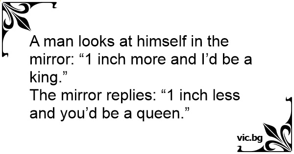 Мъж застанал пред огледалото и се хвали на жена си: - Виж скъпа, ако членът ми порасне с два сантиметра, ще стана крал. - Ако ти намалее с два, ще станеш кралица...