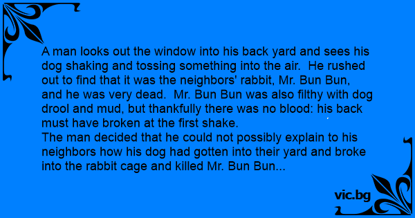 A man looks out the window into his back yard and sees his dog shaking and tossing something into the air. He rushed out to find that it was the neighbors' rabbit, Mr. Bun Bun, and he was very dead. Mr. Bun Bun was also filthy with dog drool and mud, but thankfully there was no blood: his back must have broken at the first shake.