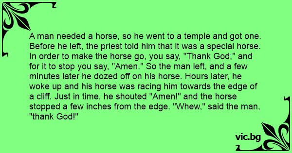 A man needed a horse, so he went to a temple and got one. Before he left, the priest told him that it was a special horse. In order to make the horse go, you say, "Thank God," and for it to stop you say, "Amen." So the man left, and a few minutes later he dozed off on his horse. Hours later, he woke up and his horse was racing him towards the edge of a cliff. Just in time, he shouted "Amen!" and the horse stopped a few inches from the edge. "Whew," said the man, "thank God!"