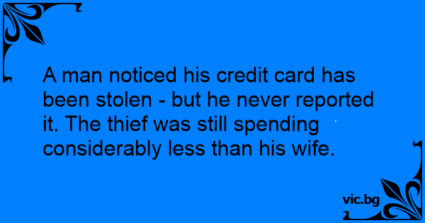 Két férfi beszélget: - Képzeld, a múltkor ellopták a feleségem hitelkártyáját! - És, tettél feljelentést? - Dehogy tettem, a rabló jóval kevesebbet költ, mint az asszony!