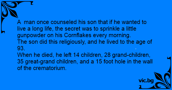 A man once counseled his son that if he wanted to live a long life, the secret was to sprinkle a little gunpowder on his Cornflakes every morning.