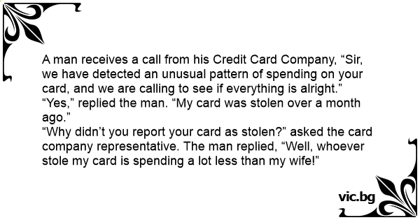 “Why didn’t you report your card as stolen?” asked the card company representative. The man replied, “Well, whoever stole my card is spending a lot less than my wife!”