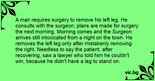 A man requires surgery to remove his left leg. He consults with the surgeon; plans are made for surgery the next morning. Morning comes and the Surgeon arrives still intoxicated from a night on the town. He removes the left leg only after mistakenly removing the right. Needless to say the patient, after recovering, saw a lawyer who told him he couldn't win, because he didn't have a leg to stand on.