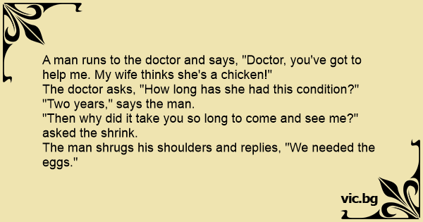 A man runs to the doctor and says, "Doctor, you've got to help me. My wife thinks she's a chicken!"