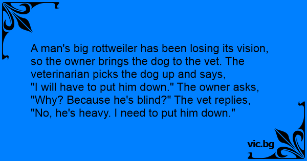 A man's big rottweiler has been losing its vision, so the owner brings the dog to the vet. The veterinarian picks the dog up and says,