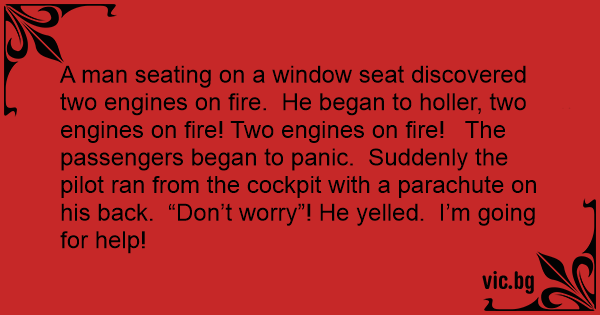 A man seating on a window seat discovered two engines on fire. He began to holler, two engines on fire! Two engines on fire! The passengers began to panic. Suddenly the pilot ran from the cockpit with a parachute on his back. “Don’t worry”! He yelled. I’m going for help!