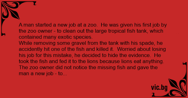 A man started a new job at a zoo. He was given his first job by the zoo owner - to clean out the large tropical fish tank, which contained many exotic species.
