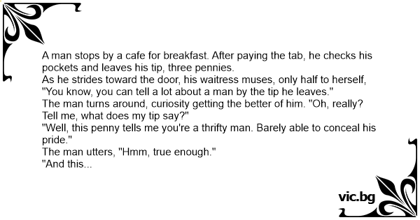 As he strides toward the door, his waitress muses, only half to herself, "You know, you can tell a lot about a man by the tip he leaves."
