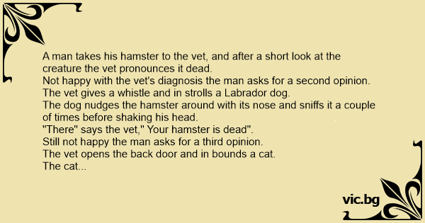 A man takes his hamster to the vet, and after a short look at the creature the vet pronounces it dead.