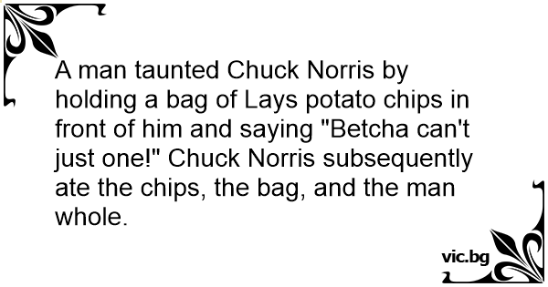 A man taunted Chuck Norris by holding a bag of Lays potato сhiрs in front of him and saying "Betcha can't just one!" Chuck Norris subsequently ate the сhiрs, the bag, and the man whole.