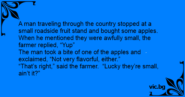 A man traveling through the country stopped at a small roadside fruit stand and bought some apples. When he mentioned they were awfully small, the farmer replied, “Yup”