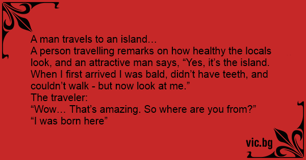 A person travelling remarks on how healthy the locals look, and an attractive man says, “Yes, it’s the island. When I first arrived I was bald, didn’t have teeth, and couldn’t walk - but now look at me.”