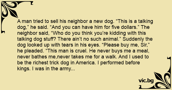 A man tried to sell his neighbor a new dog. “This is a talking dog,” he said. “And you can have him for five dollars.” The neighbor said, “Who do you think you’re kidding with this talking dog stuff? There ain’t no such animal.” Suddenly the dog looked up with tears in his eyes. “Please buy me, Sir,” he pleaded. “This man is cruel. He never buys me a meal, never bathes me,never takes me for a walk. And I used to be the richest trick dog in America. I performed before kings. I was in the army and was decorated ten times.”