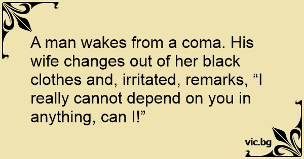 A man wakes from a coma. His wife changes out of her black clothes and, irritated, remarks, “I really cannot depend on you in anything, can I!”