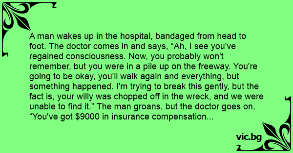 A man wakes up in the hospital, bandaged from head to foot. The doctor comes in and says, “Ah, I see you've regained consciousness. Now, you probably won't remember, but you were in a pile up on the freeway. You're going to be okay, you'll walk again and everything, but something happened. I'm trying to break this gently, but the fact is, your willy was chopped off in the wreck, and we were unable to find it.” The man groans, but the doctor goes on, “You've got $9000 in insurance compensation coming to you, and we have the technology now to build you a new willy that will work as well as your old one did, better in fact! But the thing is, it doesn't come cheap. It's $1000 an inch.” The man perks up at this. “So,” the doctor says, “it's for you to decide how many inches you want, but it's something you'd better discuss with your wife. I mean, if you had a five inch one before, and you decide to go for a nine incher, she might be a bit put out. But if you had a nine inch one before, and you decide only to invest in a five incher this time, she might be disappointed. So it's important that she plays a role in helping you make the decision.” The man agrees to talk with his wife. The doctor comes back the next day. “So,” says the doctor, “have you spoken with your wife?"