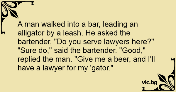 A man walked into a bar, leading an alligator by a leash. He asked the bartender, "Do you serve lawyers here?"