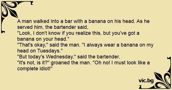 A man walked into a bar with a banana on his head. As he served him, the bartender said, "Look, I don't know if you realize this, but you've got a banana on your head." "That's okay," said the man. "I always wear a banana on my head on Tuesdays." "But today's Wednesday," said the bartender. "It's not, is it?" groaned the man. "Oh no! I must look like a complete idiот!"