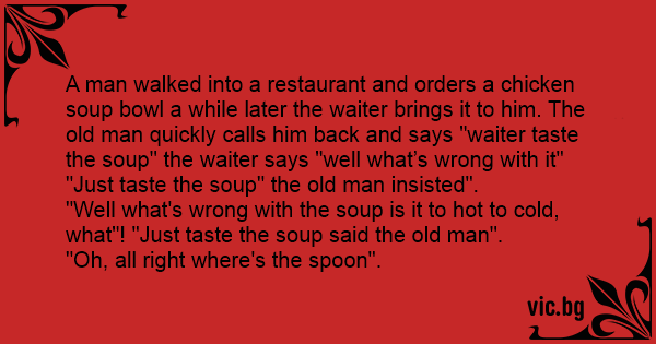 A man walked into a restaurant and orders a chicken soup bowl a while later the waiter brings it to him. The old man quickly calls him back and says "waiter taste the soup" the waiter says "well what’s wrong with it"