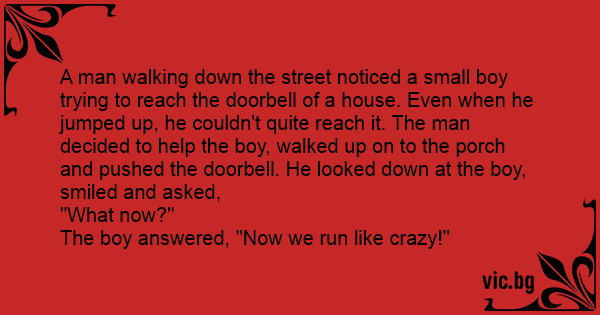 A man walking down the street noticed a small boy trying to reach the doorbell of a house. Even when he jumped up, he couldn't quite reach it. The man decided to help the boy, walked up on to the porch and pushed the doorbell. He looked down at the boy, smiled and asked,