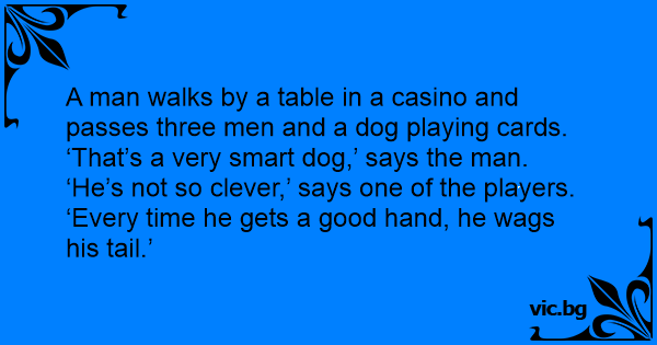 A man walks by a table in a casino and passes three men and a dog playing cards.