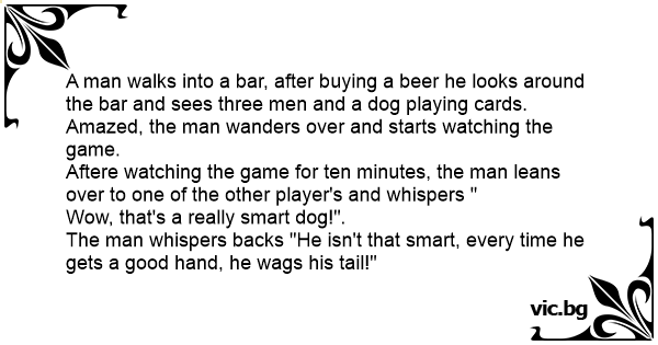 De man kan zich niet beheersen en maakt de opmerking: "Knap zeg van die hond! Dat hij kan pokeren, dat moet wel de slimste hond ter wereld zijn!" "De slimste? Haha wij zijn veel slimmer!" "Elke...