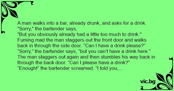 A man walks into a bar, already drunк, and asks for a drink. "Sorry," the bartender says,