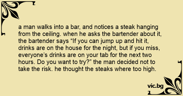 a man walks into a bar, and notices a steak hanging from the ceiling. when he asks the bartender about it, the bartender says “If you can jump up and hit it, drinks are on the house for the night, but if you miss, everyone’s drinks are on your tab for the next two hours. Do you want to try?” the man decided not to take the risk. he thought the steaks where too high.