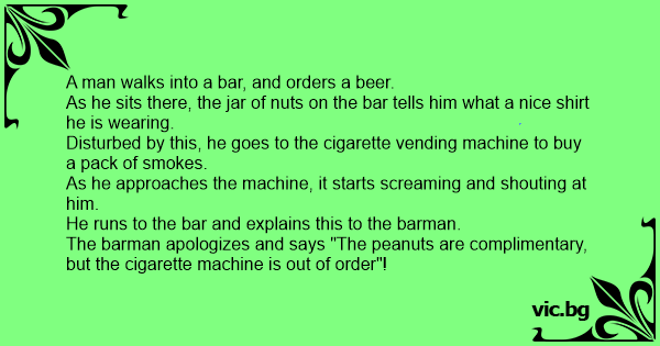 The barman apologizes and says "The peanuts are complimentary, but the cigarette machine is out of order"!