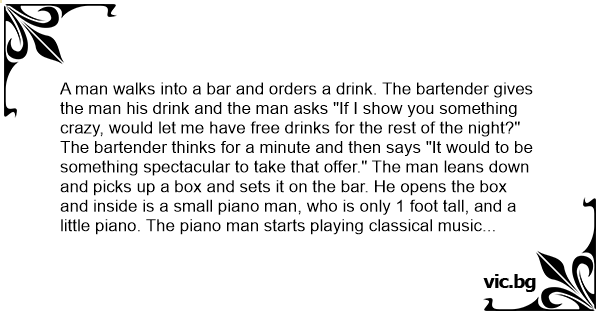 En man kom in på en bar och gick fram till bardisken och satte upp en liten man på disken. Bartendern frågade, - Vad får det lova att vara? Mannen svarar, - Jag vill ha en öl, men kan min korte lille vän, få spela på pianot? - Javisst, svarar bartendern. Den lilla mannen går fram till...