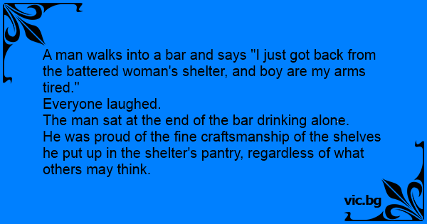 A man walks into a bar and says "I just got back from the battered woman's shelter, and boy are my arms tired."