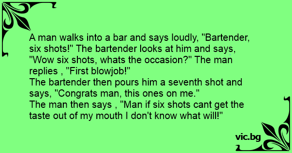 A man walks into a bar and says loudly, "Bartender, six shots!" The bartender looks at him and says, "Wow six shots, whats the occasion?" The man replies , "First blоwjob!"