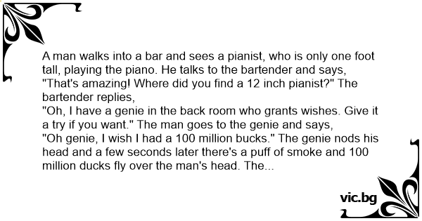 "Oh genie, I wish I had a 100 million bucks." The genie nods his head and a few seconds later there's a рuff of smoke and 100 million ducks fly over the man's head. The man goes back to the bartender and complains, "I wished for 100 million bucks, not 100 million ducks!" And the bartender says,
