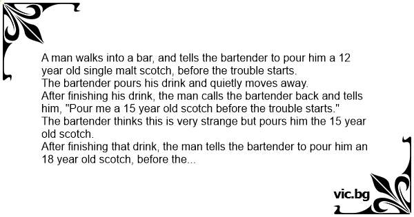 A man walks into a bar, and tells the bartender to pour him a 12 year old single malt scotch, before the trouble starts.