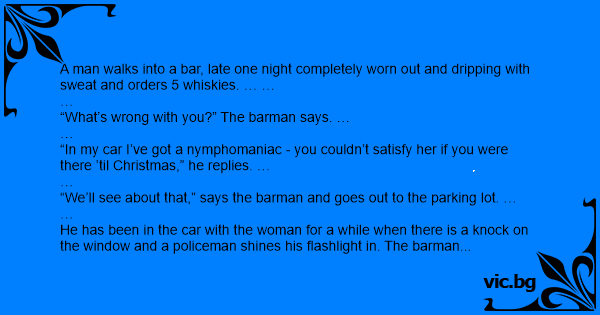 He has been in the car with the woman for a while when there is a knock on the window and a policeman shines his flashlight in. The barman jumps up and winds down the window to talk to the policeman. “It’s all right officer, I’m just shаgging the wife,” he says.