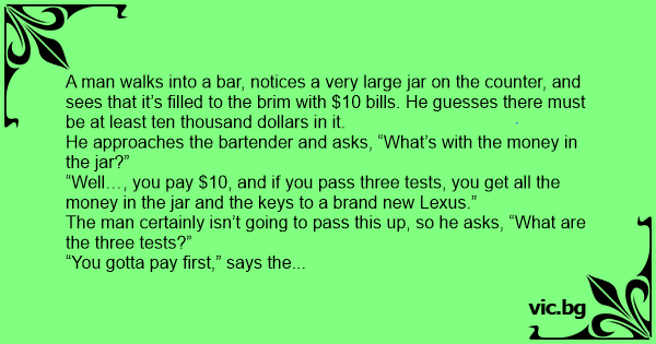 “Well…, you pay $10, and if you pass three tests, you get all the money in the jar and the keys to a brand new Lexus.”