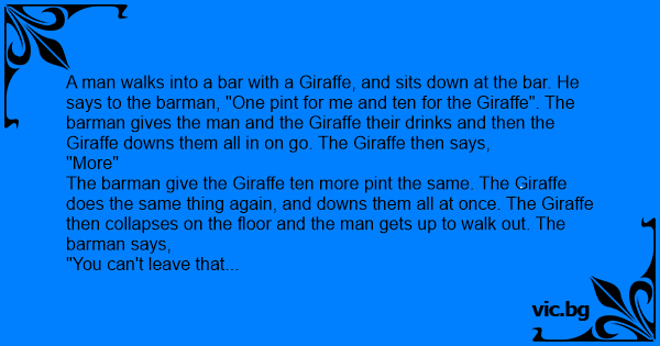 The barman give the Giraffe ten more pint the same. The Giraffe does the same thing again, and downs them all at once. The Giraffe then collapses on the floor and the man gets up to walk out. The barman says,