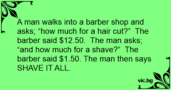 A man walks into a barber shop and asks; “how much for a hair cut?” The barber said $12.50. The man asks; “and how much for a shave?” The barber said $1.50. The man then says SHAVE IT ALL.