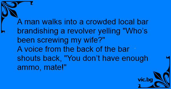 Влиза мъж в бар с пушка. - Кой е спал с жена ми? Чува се глас от дъното: - Нямаш достатъчно куршуми, пич!