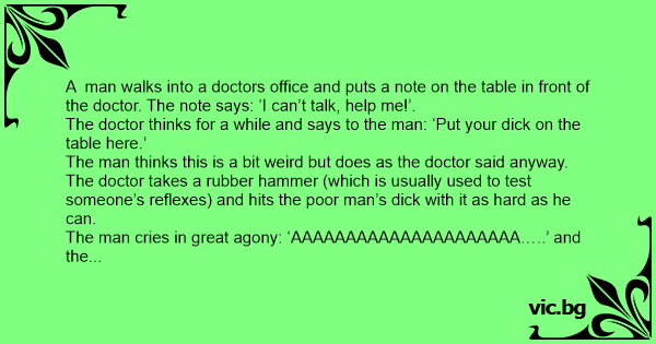 A man walks into a doctors office and puts a note on the table in front of the doctor. The note says: ‘I can’t talk, help me!’.