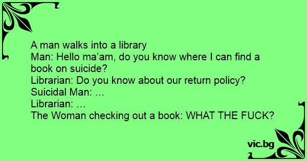 Man: Hello ma’am, do you know where I can find a book on suicide?