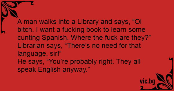 A man walks into a Library and says, “Oi вiтсh. I want a fuскing book to learn some cunting Spanish. Where the fuск are they?”