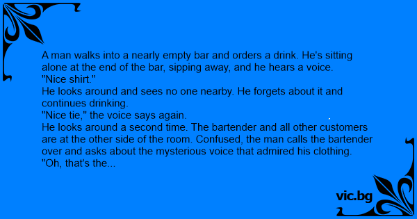 He looks around a second time. The bartender and all other customers are at the other side of the room. Confused, the man calls the bartender over and asks about the mysterious voice that admired his clothing.
