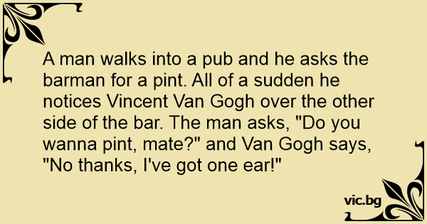 A man walks into a pub and he asks the barman for a pint. All of a sudden he notices Vincent Van Gogh over the other side of the bar. The man asks, "Do you wanna pint, mate?" and Van Gogh says,