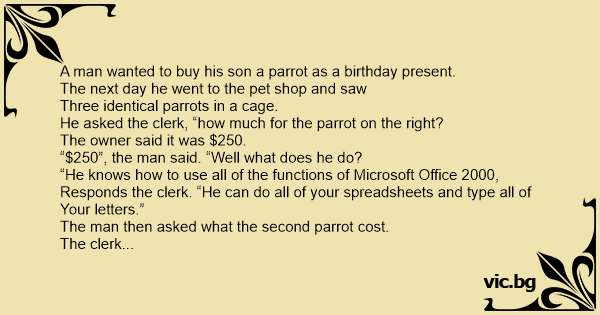 He asked the clerk, “how much for the parrot on the right?