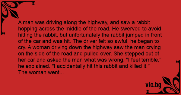 A man was driving along the highway, and saw a rabbit hopping across the middle of the road. He swerved to avoid hitting the rabbit, but unfortunately the rabbit jumped in front of the car and was hit. The driver felt so awful, he began to cry. A woman driving down the highway saw the man crying on the side of the road and pulled over. She stepped out of her car and asked the man what was wrong. "I feel terrible," he explained. "I accidentally hit this rabbit and killed it."
