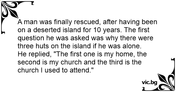 A man was finally rescued, after having been on a deserted island for 10 years. The first question he was asked was why there were three huts on the island if he was alone.