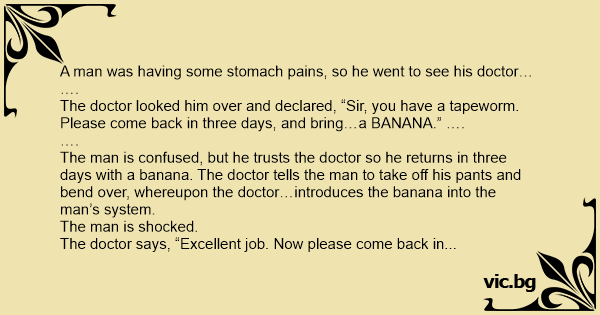 The doctor looked him over and declared, “Sir, you have a tapeworm. Please come back in three days, and bring…a BANANA.” ….