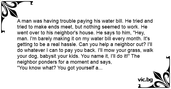 A man was having trouble paying his water bill. He tried and tried to make ends meet, but nothing seemed to work. He went over to his neighbor's house. He says to him, "Hey, man. I'm barely making it on my water bill every month. It's getting to be a real hassle. Can you help a neighbor out? I'll do whatever I can to pay you back. I'll mow your grass, walk your dog, babysit your kids. You name it, I'll do it!" The neighbor ponders for a moment and says,