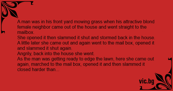 A man was in his front yard mowing grass when his attractive blond female neighbor came out of the house and went straight to the mailbox.