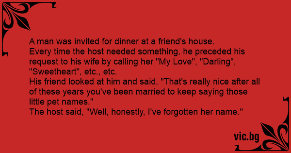 След хубавата вечеря, двете двойки станаха от масата. Дамите отидоха в кухнята, а мъжете в хола. Единият от мъжете казал на другия: